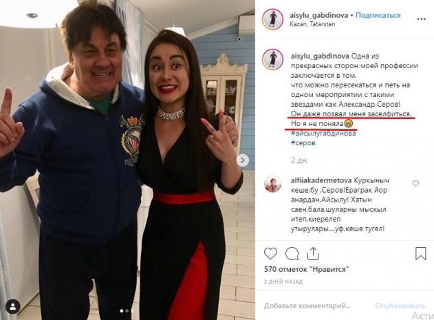 Так, юная исполнительница из Казани, Айсылу Габдинова опубликовала совместный снимок с Серовым, под которым поблагодарила певца за честь «петь на одном мероприятии», а в заключение многозначительно добавила: