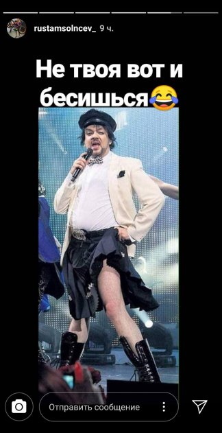 Солнцев обычно высказывает свое отношение к той или иной личности прямо, без каких-либо намеков, которые многие попросту могут не понять. Однако публикация, посвященная Филиппу Киркорову, имеет неоднозначный смысл. В своих stories Рустам опубликовал кадр с выступления короля эстрады. На снимке Филипп Бедросович запечатлен в довольно странном наряде. Юбка на артисте — первое, что бросается в глаза. «Не твоя вот и бесишься», — оставил шоумен подпись на кадре.