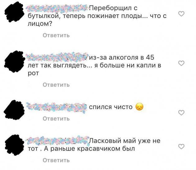 В возрасте 45-и лет мужчины не выглядят так, как Юрий. Конечно, если они не «дружны» с бутылкой. Такое резкое старение можно списать лишь на алкоголь. Фолловеры решили, что Шатунов из-за злоупотребления высокоградусными напитками превратился в старика.
