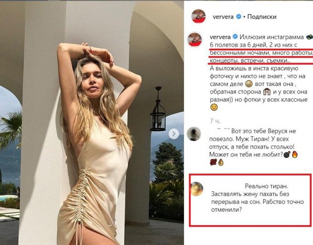 О том, насколько сильно красивая жизнь на снимках в Сети отличается от горькой реальности, 37-летняя Вера Брежнева рассказала поклонникам в своём Instagram. По словам певицы, в течение шести дней ей пришлось пережить шесть перелётов, при этом два дня сопровождались бессонными ночами, а всё из-за неподъёмного количества работы, концертов, съёмок и встреч.