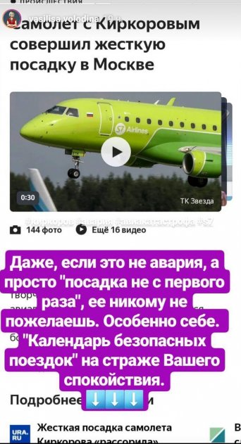 Киркоров возвращался в Россию из болгарской Варны с двумя несовершеннолетними детьми. Во время посадки самолёт ударился о взлётно-посадочную полосу при посадке, после чего из-за ветра пошёл на второй круг. Киркоров поблагодарил пилотов за профессионализм, а в Instagram написал, что навсегда запомнит эти 30 минут.