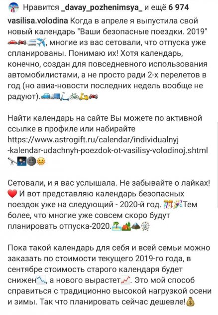 Телеведущая программы «Давай поженимся!» позиционирует себя больше, как астролога. Она составляет индивидуальные календари, подсказывает профессии по гороскопу, составляет гороскоп 2019 «Кому нельзя делать пластику», а также календарь безопасных поездок. Василиса несколько часов назад опубликовала stories в Instagram, где сочувствует Филиппу Киркорову: «Даже, если это не авария, а просто посадка не с первого раза, её никому не пожелаешь. Особенно себе. Календарь безопасных поездок на страже вашего спокойствия». Астролог решила прорекламировать свой календарь на чрезвычайной ситуации с Киркоровым и подзаработать. Василиса данной публикацией намекает, что если бы поп-король приобрёл у неё данный календарь, то данной ситуации бы не возникло, и он мог избежать неприятной ситуации. Люди едва не погибли, а Володина все календари пытается продать.