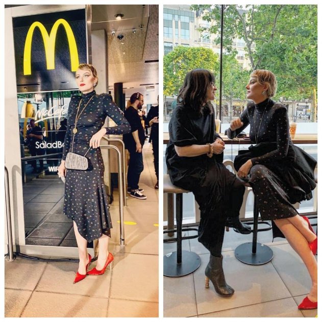 В своем Instagram-альбоме Рената Литвинова опубликовала фото - она в шикарном черном платье и красных лодочках позирует на фоне кафе Mc'Donalds. Казалось бы, перепутала женщина в возрасте бургерную с театром, и что? Бывает. Сфотографировалась и пошла себе дальше, но нет! Оказывается не перепутала. На следующем фото видно, что и зашла, и за столиком с подругой посидела, а, возможно, (в обход диеты) и маффином перекусила, а вот то, что наряд «не в тему» - звезда не заметила.