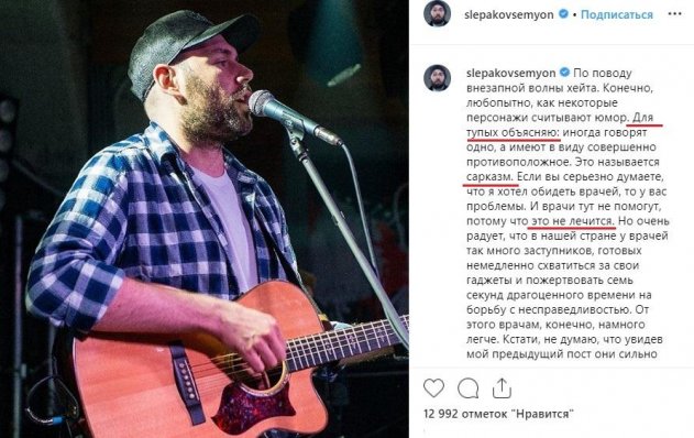 «Для тупых объясняю: иногда говорят одно, а имеют в виду совершенно противоположное. Это называется сарказм. Если вы серьезно думаете, что я хотел обидеть врачей, то у вас проблемы. И врачи тут не помогут, потому что это не лечится», – не стесняясь новой войны недовольства, высказался Семён.