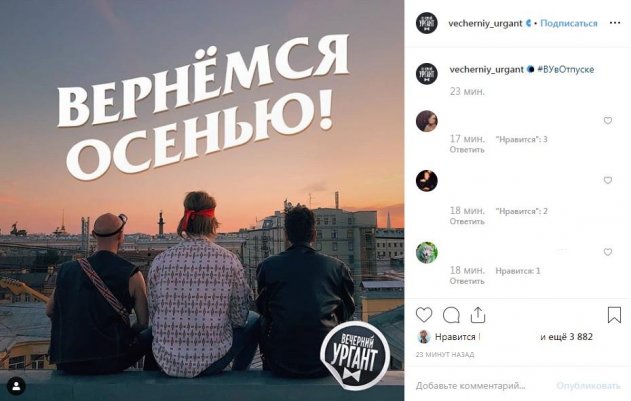 Коллектив телепередачи «Вечерний Ургант» ушел в отпуск на все лето. Об этом на своей странице в Instagram сообщил ведущий шоу Иван Ургант. Примечательно, что шоуменом не была названа дата возвращения. Ни точного числа, ни месяца — какие-то уж слишком длительные и неопределенные каникулы получаются.