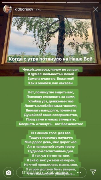 Так, сегодня утром последний опубликовал в Instagram Stories цитату из стихотворения Александра Пушкина, в которой были такие фразы: «Чужой для всех, ничем не связан»,«Трачу судьбой отсчитанные дни. И так уж тягостны они. Я знаю: век мой уж измерен».