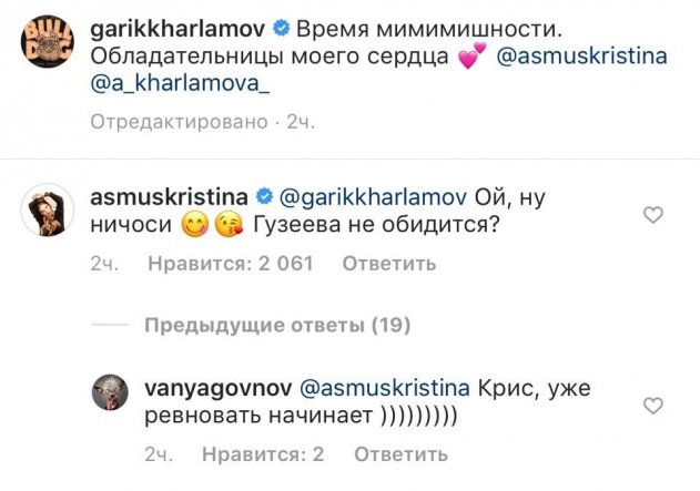 «Ой, ну ничоси. Гузеева не обидится?», - присоединилась Кристина к издевкам над Гузеевой. Большинство подписчиков предположили, что Кристина начала ревновать своего мужа к Ларисе, и видимо, Харламова и Гузееву что-то связывало. Скорее всего, Кристина высказала юмористу свое негодование по поводу стольких публикаций посвященных другой женщине, и он решил таким образом извиниться перед женой. Можно подумать, что интрижка между Гариком и Ларой - бред. Но многие вспомнят, как актер Дмитрий Нагиев рассказывал Дудю в интервью, что дикая Лара буквально затащила его в постель в студенческие годы, несмотря на то, что она старшего него на 8 лет.
