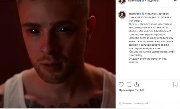 Егор Крид впервые как самостоятельный исполнитель порадовал фанатов не типичной для своего «лейбловского» репертуара песней «Грехи». Недавно появился и клип, точнее, как говорит сам рэпер, «картина». Неординарная задумка, которая для многих покажется даже странной и сверхъестественной, является вовсе не выдумкой и свободным полётом фантазии, а реальной историей из жизни, что подтвердил и сам Егор в Instagram.