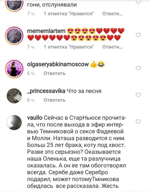 «Сейчас в Star News прочитала, что после выхода в эфир интервью Темниковой о сексе с Фадеевым и Молли. Наташа с ним разводится. Юольше 25 лет брака коту под хвост. Разве это серьезно? Оказывается, наша Оленька, еще та разлучница оказалась. А он ее там обоготворял всегда. Серябе даже Серебро подарил, может потому Темникова обиделась и все рассказала», - написала фанатка Ольги.