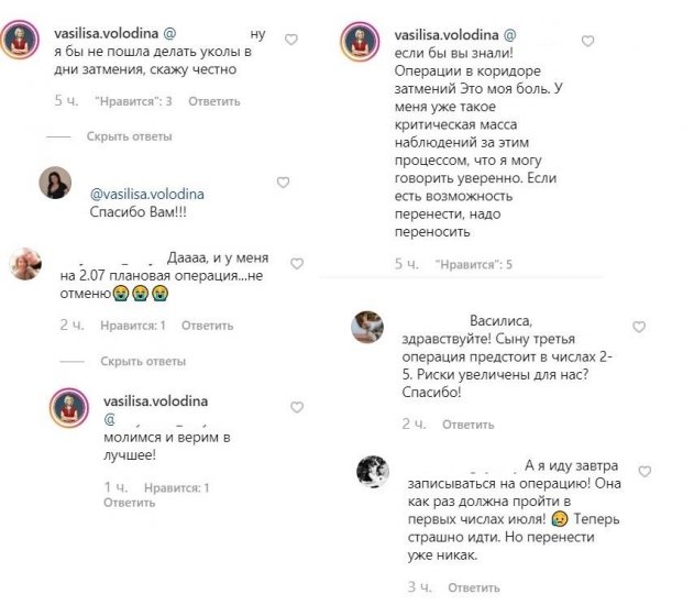 Особенно взволновали и напугали слова «авторитетного астролога» тех, кто намеревался в этот период обратиться за медицинской помощью к врачам или вовсе отдаться в руки хирургов. Но Володина не только не пожелала успокаивать потенциальных покупателей своих предсказаний, но и ещё больше подлила масла в огонь, запугав их горьким опытом наблюдений за операциями в коридоре затмений.