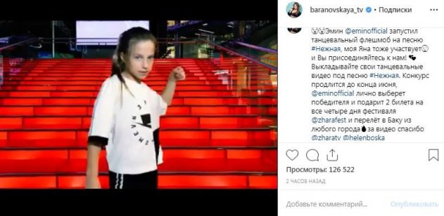 Судя по всему, Барановская отказалась от любви ради карьеры дочки Яны, и пока ее тело принадлежит Эмину, а сердце - Борисову, девочка может стать успешной танцовщицей. Накануне звезда прорекламировала танцевальный флешмоб, который недавно запустил Эмин. Правила участия просты: необходимо лишь поделиться в Instagram танцевальным видео под песню «Нежная». Победителя помимо популярности и успеха ждут 2 билета на все четыре дня фестиваля «Жара» и перелёт в Баку из любого города».
