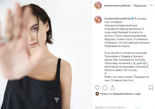 Это заявление в своих социальных сетях Темникова назвала откровенной ложью и выдумками яркой фантазии Серябкиной. В подтверждении своих слов бывшая участница группы предложила собраться для установления истины в прямом эфире у блогера. По итогу, Темникова чужим «грязным бельём», романом Фадеева и Ольги, решила накрутить просмотры Ивлеевой.