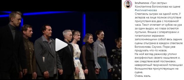 Точнее сказать, Брухунова раскритиковала режиссёрскую деятельность Богомолова после того, как побывала у него на спектакле под названием «Три сестры». Довольно резкая реакция со стороны ассистентки комика стала настоящей сенсацией, ведь ранее в её микроблоге появлялись сугубо положительные отзывы о творчестве других людей. Агрессивное поведение Татьяны может указывать на то, что её любовником был Петросян, а теперь им стал Максим Виторган, также занимающийся театральной режиссурой. По всей видимости, увлечение театром сблизило творческие души и отныне Виторган и Брухунова поддерживают тайную романтическую связь.