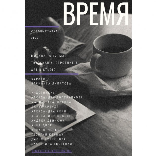 16 мая - 17 мая в галерее Art-D на Тверской 6, стр. 6 в Москве пройдет выставка художественной фотографии «Время». Выставка уникальна тем, что она собрала буквально звездную команду художников, таких как Дарья Арендт, Александра Голубчикова, Анна Двор, Андрей Денисюк, Екатерина Евсеенко, Дарья Кузнецова Александра Кейн, Георгий Кеймах, Анастасия Лысковец, Мария Татарникова и Анна Юрченко.