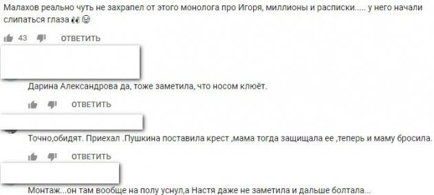 В эфире «Настиных страстей» отчетливо видно, что находясь в комнате у Волочковой Андрей Малахов из последних сил боролся со сном, стыдливо прикрывал лицо рукой, усиленно моргает, хлопает глазами в надежде отогнать дремоту.