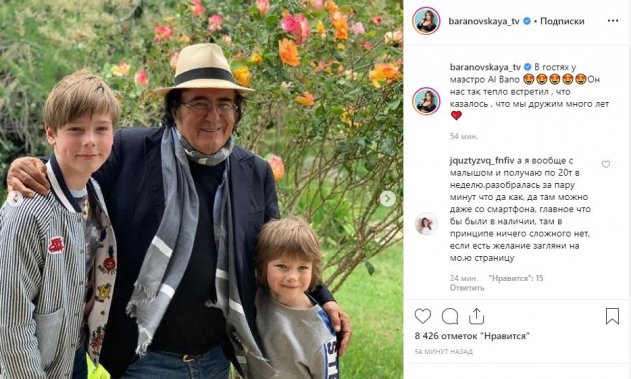 Тем не менее, многое о том, что происходит в ее жизни, можно понять, если следить за ее аккаунтом в Instagram. К слову, накануне там появились свежие снимки телеведущей с Италии. Как оказалось, за границей она вместе с наследниками гостила у знаменитого эстрадного певца Аль Бано. «Он нас так тепло встретил, что казалось, что мы дружим много лет», - похвасталась Барановская, завершив пост эмоджи в виде красного сердца.