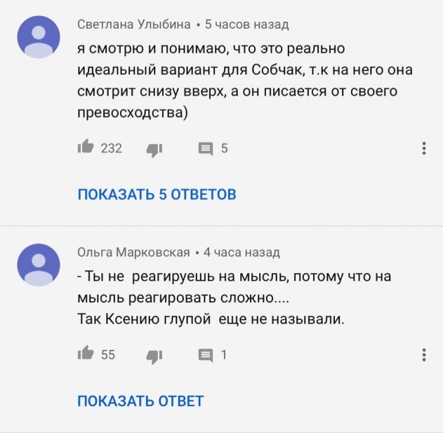 «Ты не реагируешь на мысль, потому что на мысль реагировать сложно. Так Ксению глупой еще не называли», - пишут инсайдеры. Ксении, по-видимому хочется, чтоб ее всячески унижали, а не носили на руках.