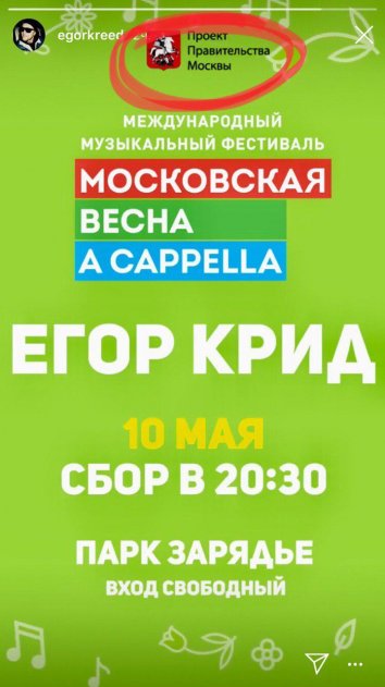 Фестиваль «Московская весна A Cappella» пройдет в третий раз. На мероприятие одним из исполнителей заявлен Егор Крид. Музыкант сам опубликовал в своем Instagram афишу предстоящего действа.