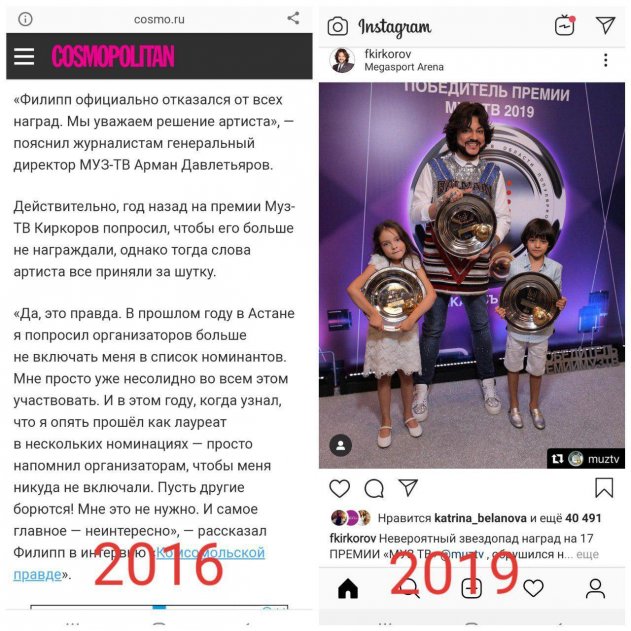 И всё бы ничего, только буквально несколько лет назад артист категорично отказывался от участия в церемонии, ссылаясь на не солидность участия 52-летнего певца среди молодёжи. Тогда Филипп настоятельно просил организаторов не вносить певца в номинации ради продвижения новых талантов. Возникает вопрос, что изменилось спустя 3 года и почему Филипп Бедросович, словно по щучьему велению, сменил решение? Не исключено, что Киркоров «возвращением» на «Муз-ТВ» может оттягивать закат карьеры. Ведь, очевидно, последние годы престарелого исполнителя на плаву держат исключительно совместные работы с молодыми артистами и провокационные клипы под редакцией «хайповых» сценаристов. Так или иначе, а потребность самолюбования лишь выставила Киркорова безответственным и эгоистичным мужчиной, не способным ответить за свои слова и поступки.