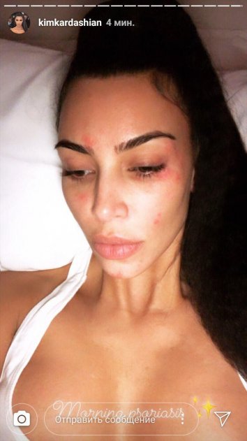 Поклонники Ким Кардашьян знают, что американская модель и бизнес-леди который год борется с псориазом. Дерматологическая болезнь доставляет массу неудобств, и во время обострения тело и лицо покрываются воспаленными красными пятнами. Недавно Ким снова выложила фото, которое подписала просто и незатейливо: «Утренний псориаз».