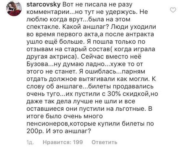 Олечка Бузова недавно выступала в театре в Санкт-Петербурге, о чем незамедлительно предупредила своих фанатов. После концерта Ольга страстно и трепетно делилась впечатлениями о прошедшем. Звезда несколько раз говорила, что зал аплодировал стоя и всем пришлось по нраву ее актерская игра. Пользователи сети раскритиковали Ольгу и поймали ее на лжи. Один из пользователей поведал всем реальную картину происходящего. «Билеты покупали пенсионеры по 200 рублей, люди уходили во время первого акта, а после антракта ушло еще больше.