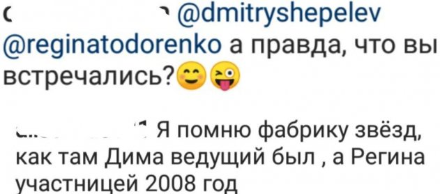 Дмитрий Шепелев недавно встретился со своей старой хорошей знакомой Региной Тодоренко, и стал главным героем ее авторского шоу «Пятница с Региной». Дмитрий пообещал поклонникам, что они затронут самые интересные темы из его биографии, и не исключено, что вспомнят былое. Фанаты напомнили, что в 2008 году знаменитостей впервые свела судьба на музыкальном проекте «Фабрика звезд – 2», где Шепелев начинал карьеру телеведущего, а Тодоренко была одним из ярчайших дарований.