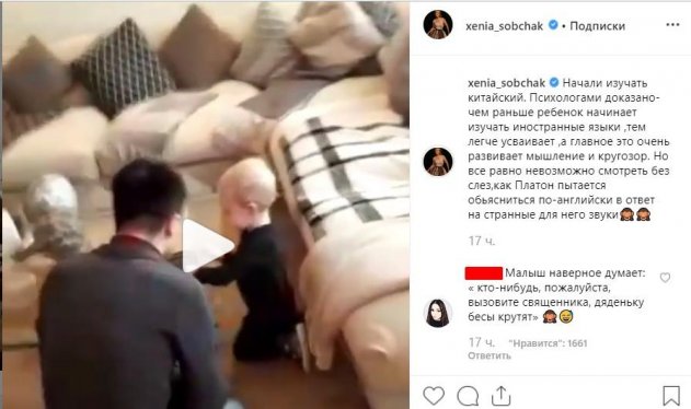 Собчак к видео дала комментарий: «Психологами доказано, чем раньше ребенок начинает изучать иностранные языки, тем легче усваивает...Но все равно невозможно смотреть без слез, как Платон пытается объясниться по-английски в ответ на странные для него звуки».