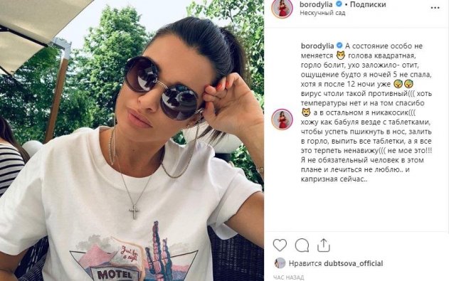 «А состояние особо не меняется…Голова квадратная, горло болит, ухо заложило – отит, ощущение будто я ночей 5 не спала…Хожу как бабуля везде с таблетками, чтобы успеть пшикнуть в нос, залить в горло, выпить все таблетки, а я все это терпеть ненавижу. Не мое это! Я не обязательный человек в этом плане и лечиться не люблю…и капризная сейчас», – отметила Ксения у себя в профиле Instagram.