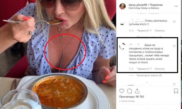 В последнее время Даша Пынзарь всё чаще подвергается критике со стороны фанатов: целлюлит на ногах, распущенность и плохое материнство. Очередным поводом для недовольств стало излишняя страсть Даши к вредной пище. В соцсети звезда «Дома-2» опубликовала новый ролик из похода в ресторан, где похвасталась невероятным обедом традиционной кухни. И всё бы ничего, вот только за глубоким декольте Даша «засветила» последствия обжорства. Прыщи и неоднозначная пигментация на коже всерьёз напугали фанатов.