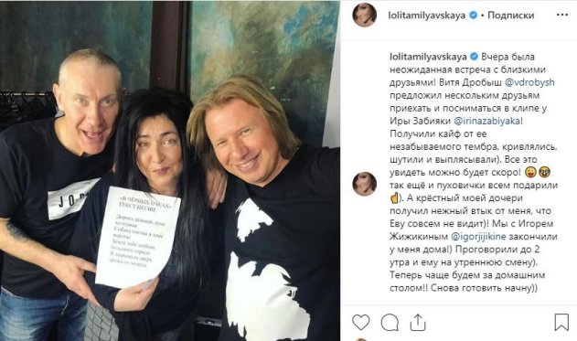 Лолита написала: «Вчера была неожиданная встреча с близкими друзьями! Витя Дробыш предложил нескольким друзьям приехать и посниматься в клипе у Иры Забияки! Получили кайф от её незабываемого тембра, кривлялись, шутили и выплясывали. Все это увидеть можно будет скоро! А крёстный моей дочери получил нежный втык от меня, что Еву совсем не видит! Мы с Игорем Жижикиным закончили у меня дома! Проговорили до 2 утра и ему на утреннюю смену. Теперь чаще будем за домашним столом!!! Снова готовить начну».