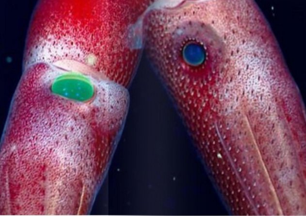 Не менее впечатляющей находкой стал кальмар. Этот монстр известен как Histioteuthis heteropsis или Strawberry Squid, и является разновидностью кальмара с «петушиными глазами», один из которых маленький и синий, а другой - большой и желтый. Благодаря такому строению этот косоглазный «ягодный» кальмар может одновременно выискивать добычу и контролировать хищников сверху и снизу, а для маскировки он использует собственную тень или яркое неоновое свечение, которое, распространяясь в воде, делает его размеры еще более внушительными.