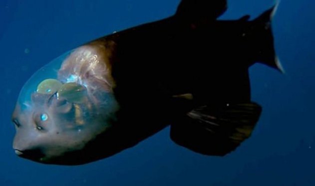 Третьим объектом для наблюдения дайверов стала странная рыба, которая называется опистопрокт. Этот житель «сумеречной зоны» имеет прозрачный череп, наполненный желеобразной массой, сквозь которую он может видеть все, что творится над его головой.