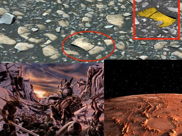 Американский марсоход Curiosity постоянно исследует поверхность красной планеты и отправляет в NASA различные фотографии. Присланные им на этой неделе снимки могут стать важным доказательством того, что на Марсе действительно существовала цивилизация, конец которой положил крупный военный конфликт. Популярным уфологом Скоттм Уоррингом на красной планете был найден топор древних великанов, а также следы сражения. На снимках NASA можно отчетливо разглядеть предпологаемое орудие, напоминающий аналогичные топоры у викингов, несколько щитов и другие подозрительные предметы.