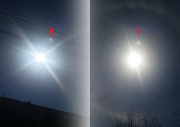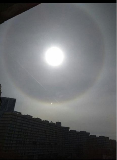 Сразу два поразительно похожих явления зафиксировали очевидцы в небе над столицей России и Севастополем. В Сети появились снимки, на которых четко видно солнечной гало примерно одинакового размера. Единственная разница – в Москве странное сферическое тело находится внизу, на горизонте гало, а в Севастополе оно уже прошло 3/4 расстояния до Солнца.