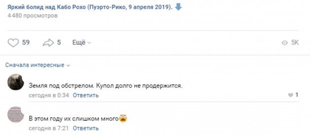 Приверженцы коспирологических теорий с опаской смотрят в будущее, ведь верят в его возможную отмену. Люди всё чаще интересуются новостями, чтобы быть в курсе событий в мире. Только успели россияне отойти от событий с ярким болидом в небе над Красноярском, как сегодня сообщили о новом странном объекте над Башкирией. Может сложиться впечатление, что только РФ страдает от ярких вспышек и неизвестных космических объектов, но это не так. В Лондоне и Пуэрто-Рико также замечены метеориты в небе. Люди на основании всех данных предвидят скорый апокалипсис. Такие комментарии даже пишут в соцсети: «Земля под обстрелом: Купол долго не продержится».
