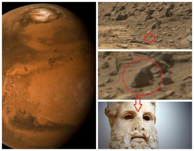 Накануне NASA опубликовали снимок, на котором альтернативный учёный сумел отыскать голову греческого бога Зевса. Как известно это уже вторая голова, найденная на поверхности красной планеты. Недавно там нашли камень, по своей форме отчетливо напоминающий голову древнегреческого философа Сократа. Данная находка отличается наличием волос и бороды, однако ее размер совсем не велик – от 3 до 6 дюймов. Сомнений нет, что на Марсе была жизнь, ведь недавно там нашли еще и воду, однако произошёл апокалипсис и все было уничтожено.