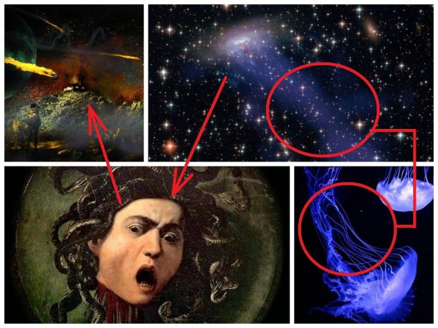 Недавно в объектив NASA попала невероятная галактика, отчетливо напоминающая медузу. Уфологи уверены, что так пришельцы подали организации знак, ведь совсем недавно на поверхности Марса была найдена голова Сократа, а затем Зевса. Что напрямую подтверждает теорию о жизни на красной планете. Показав «Медузу Горгону» человечеству, инопланетяне продемонстрировали свое недовольство происходящим. Им не нравятся исследования людей и их воздействие их техники.
