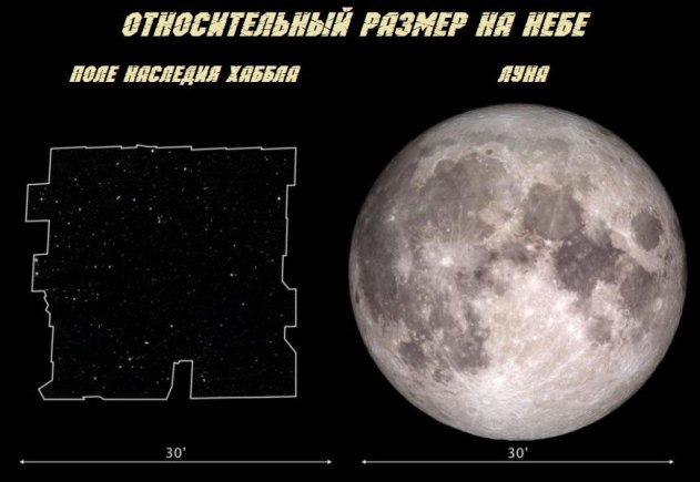 Недавно, астрономы из Центра космических полетов Годдарда собрали в одном изображении самую большую и невероятную «книгу истории» галактик. Они вели свои наблюдения на протяжении 16 лет и использовали полученные данные, с космического телескопа Хаббла НАСА для постройки изображение. На рисунке сравниваются размеры Поля Наследия Хаббла на небе с угловым размером Луны.