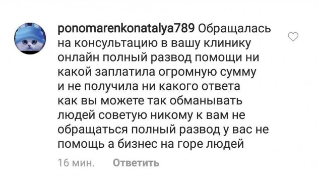 «Обращалась на консультацию в вашу клинику онлайн полный развод, помощи никакой. Заплатила огромную сумму и не получила никакого ответа. Как вы можете так обманывать людей? Советую никому к вам не обращаться, полный развод. У вас не помощь, а бизнес на горе людей», - написала Наталья на ее странице в Instagram.
