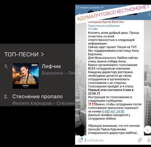 Недавно в сеть «слили» тайную переписку, которая касается вокального шоу «Песни» на ТНТ. В этом году свои команды создал Тимати и Баста, поэтому сейчас между их избранниками напряженная борьба. Шоу вышло на этап телефонных голосований, поэтому победа в руках зрителей. В опубликованном сообщении речь шла о том, что победить должна Анна Боронина. Именно за нее просили отправить свои голоса и прислать скрин-подтверждение на специальный номер, принадлежащий сотруднику лейбла Black Star. Также отмечалось, что это личная просьба Павла Курьянова, более известного под псевдонимом Пашу.
