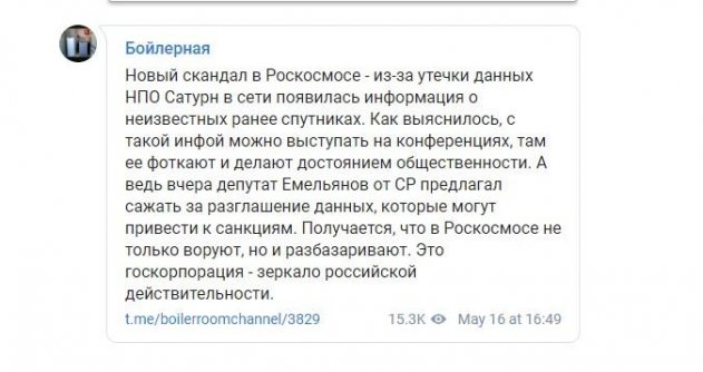 Публика не успевает уставать от новых историй, поступающих из «Роскосмоса». Буквально вчера глава Следственного комитета Бастрыкин рассказывал о том, что в стане ведомства воруют миллиарды рублей, как уже сегодня Telegram-канал «Бойлерная» поделился новыми, не менее скандальными данными. Выяснилось, что утечка в сеть данных НПО Сатурн, из-за которых в сети появилась информация о ранее неизвестных российских спутниках, вполне может становится достоянием общественности. Эксперты канала утверждают, что выступать с ней можно на конференциях, где ее фотографируют, активно обсуждают, а, следственно, после выкладывают на просторах сети. Никакими ограничениями или, тем более, законами никто это не сдерживает.