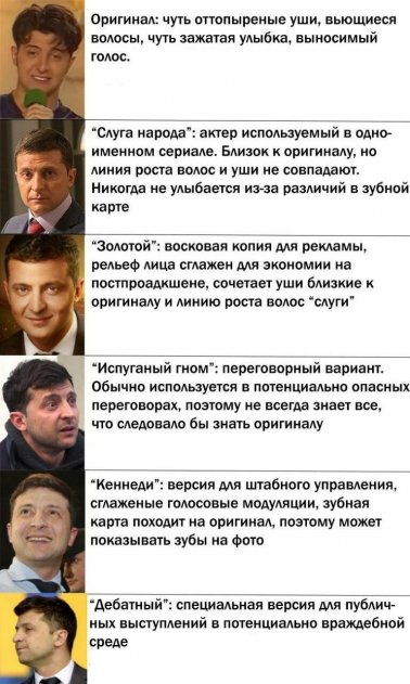 По интернету ходит подборка точно таких же различающихся друг с другом фотографий современного российского президента Владимира Путина. Получается, что Зеленский, дабы удержаться у власти, клонирует привычки Путина. Двойники должны подменять не имеющего опыта государственного управления Зеленского в различных публичных выступлениях, позволяя ему выкроить больше свободного времени для управления страной и обезопасить свою жизнь.