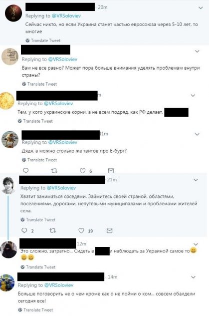Высказывание журналиста собрало не совсем те комментарии, которые ожидалось. Соловьева осадили за «желчь» об инаугурации Зеленского. «Хватит заниматься соседями», — пишут в ответ россияне. По мнению Рунета, российский журналист слишком много внимания уделяет чужой стране и ее проблемам, в то время как в России множество бед остается без внимания СМИ. Россияне устали от масштабного освещения в своих телевизорах украинских событий, которые никак не повлияют на их жизни. Не обошлось и без упоминания Екатеринбурга. Соловьева упрекнули в том, что в его соцсети нашлось место Зеленскому, а не скандалу со строительством храма.