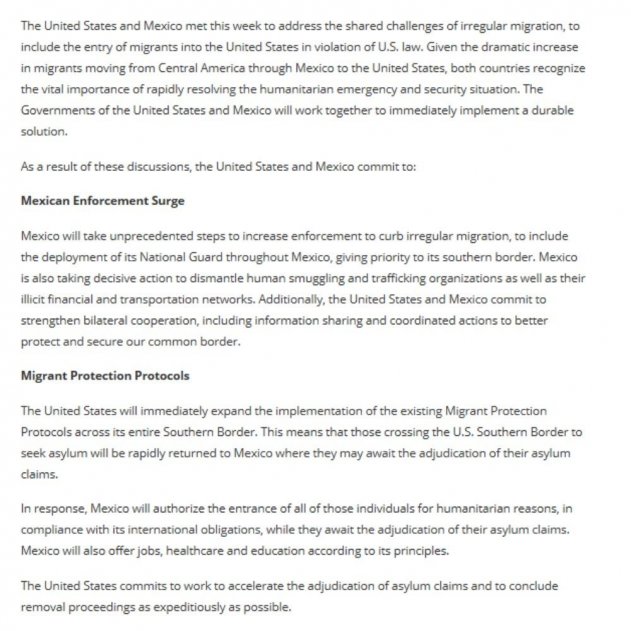 Майк Помпео не упустил возможности прокомментировать данное америко-мексиканское соглашение. Он отметил что США с нетерпением ждут совместной работы с Мексикой для более надежной защиты южных границ от нелегальных беженцев.