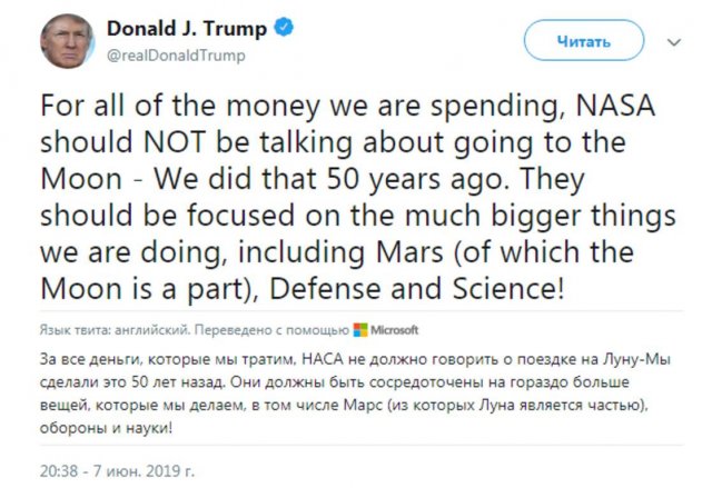 В своём микроблоге Трамп призвал NASA не заниматься пустяками, такими, как освоение Луны, а сконцентрироваться на более серьёзных вещах, таких, как Марс. В скобках, американский президент многозначительно добавил (частью которого, является Луна).