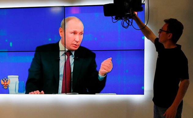 Каждый год российский президент Владимир Путин проводит большое шоу, в котором исполняет главную роль. Это многочасовой телемарафон вопросов и ответов, во время которого президент выслушивает жалобы людей, обещает решить их проблемы и объясняет свою точку зрения по обширному кругу тем и вопросов. А поскольку люди присылают более миллиона вопросов, организаторы этой «Прямой линии» могут их тщательно отбирать. Но в этом году во время ежегодного шоу возникла одна загвоздка. В четверг в эфире звучали неправильные вопросы типа того, что появился на экране: «Только один вопрос: когда вы уйдете?»