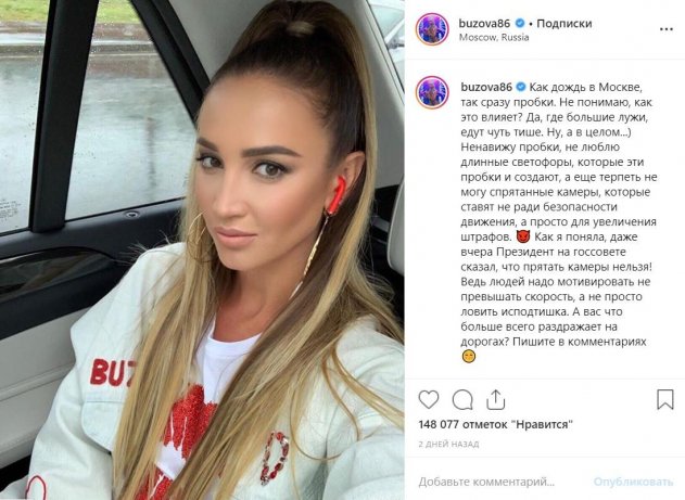 Очередным доказательством этого послужил ее недавний Instagram-пост, в котором она осудила власти Москвы за скрытые камеры наблюдения на дорогах Москвы, которые установлены якобы только ради «более высоких штрафов». Не забыла девушка и про лестный отзыв в сторону президента Путина, который также отмечал необходимость решения этой проблемы.