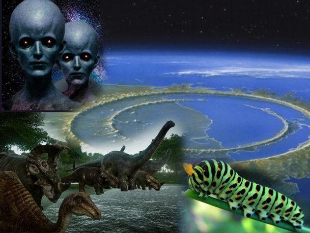 Уфологи Джейсон Мартелл и Джорджио Цукалос считают, что к появлению и исчезновению динозавров причастна и рука пришельцев. Никто ведь не знает, почему на Земле появились такие гигантские создания. Уфологи предполагают, что на нашей планете проходил эксперимент внеземного разума. Инопланетяне могли перевезти динозавров из другого места, либо повлияли на ДНК более мелких животных. Когда эксперимент пришельцев подошёл к концу, они просто решили «зачистить» Землю. По словам уфологов, тот объект, который образовал кратер Чиксулуб, мог быть не метеоритом, а многотонным ядерным зарядом или сильнейшей бомбой. На самом деле, никто не может гарантировать, что люди не являются такими же «лабораторными мышами», какими в своё время могли быть динозавры.