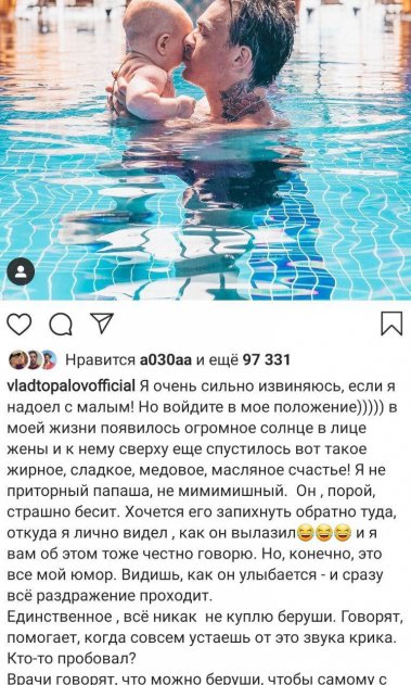 «Я не приторный папаша, не мимимишный. Он, порой, страшно бесит. Хочется его запихнуть обратно туда, откуда я лично видел, как он вылазил и я вам об этом тоже честно говорю», - написал Влад ссылаясь на свой юмор.
