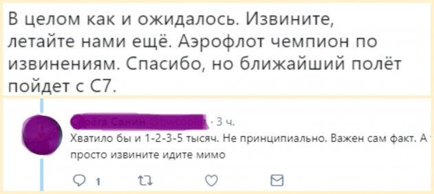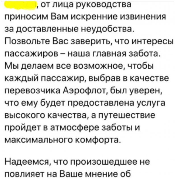 «Аэрофлот», в свою очередь, попытался уверить негодующего клиента, что они делают все возможное, чтобы пассажиры были уверены в качестве обслуживания и весьма надеются, что произошедшее не будет иметь влияния на мнение клиента об авиакомпании.